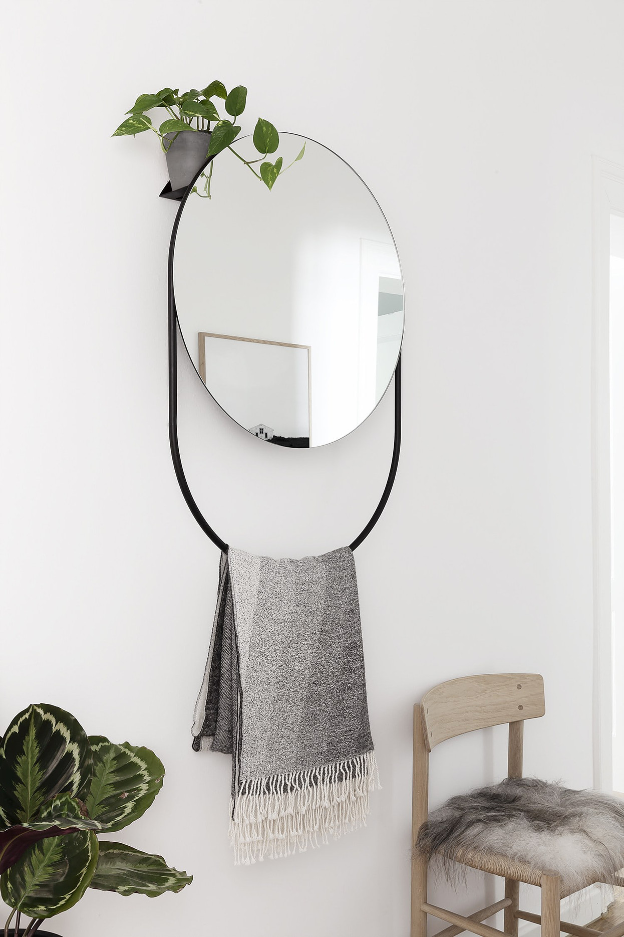 Ayna, işlevsel bir perspektifle basit şekillerin kombinasyonu ile 1950’lerden itibaren metal mobilya ilhamıyla tasarlanmıştır. Aynanın arkasında bitkiler veya kullanışlı olabilecek diğer küçük nesneler için alan sağlayan bir raf bulunur. Rafın içindeki iki küçük kesik, kıyafetleri asmak için kullanılır. Üçüncü bir kol olarak işlev gören ayna çerçevesidir. Kapıdan çıkmadan önce yanınıza almayı unutmanız gereken günlük nesneleri asmak için kullanılabilir.