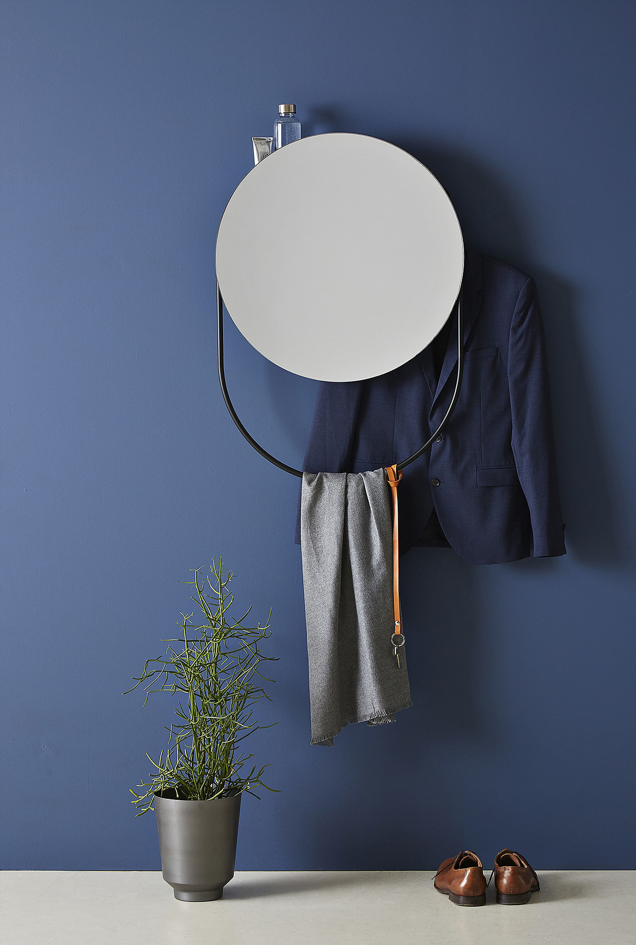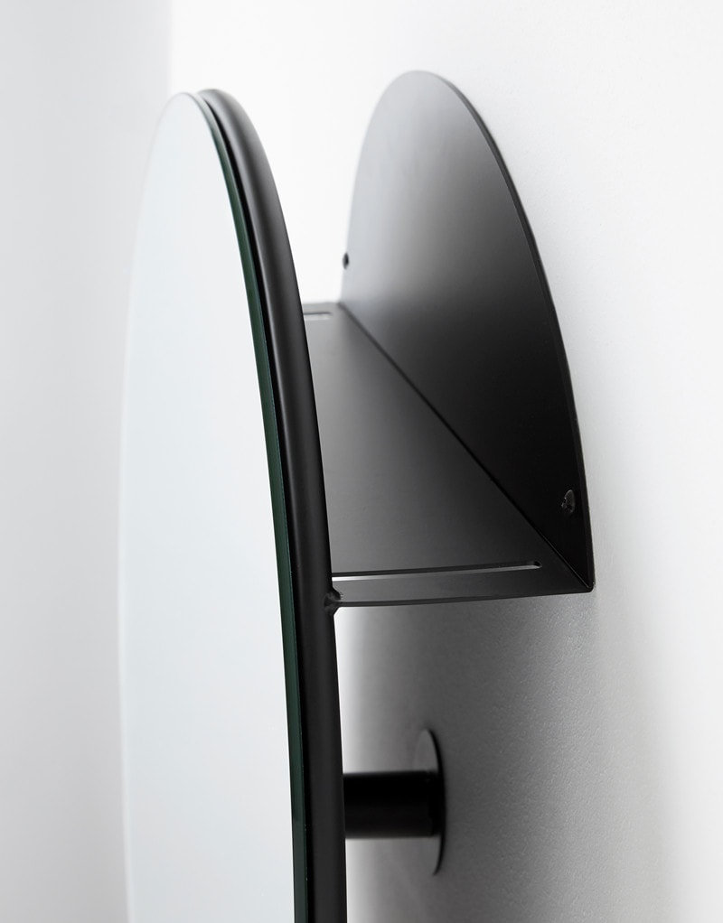 Ayna, işlevsel bir perspektifle basit şekillerin kombinasyonu ile 1950’lerden itibaren metal mobilya ilhamıyla tasarlanmıştır. Aynanın arkasında bitkiler veya kullanışlı olabilecek diğer küçük nesneler için alan sağlayan bir raf bulunur. Rafın içindeki iki küçük kesik, kıyafetleri asmak için kullanılır. Üçüncü bir kol olarak işlev gören ayna çerçevesidir. Kapıdan çıkmadan önce yanınıza almayı unutmanız gereken günlük nesneleri asmak için kullanılabilir.