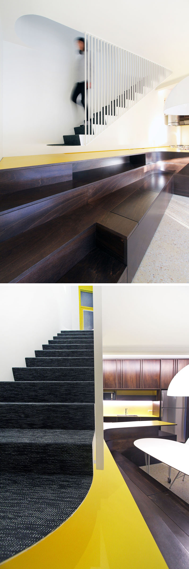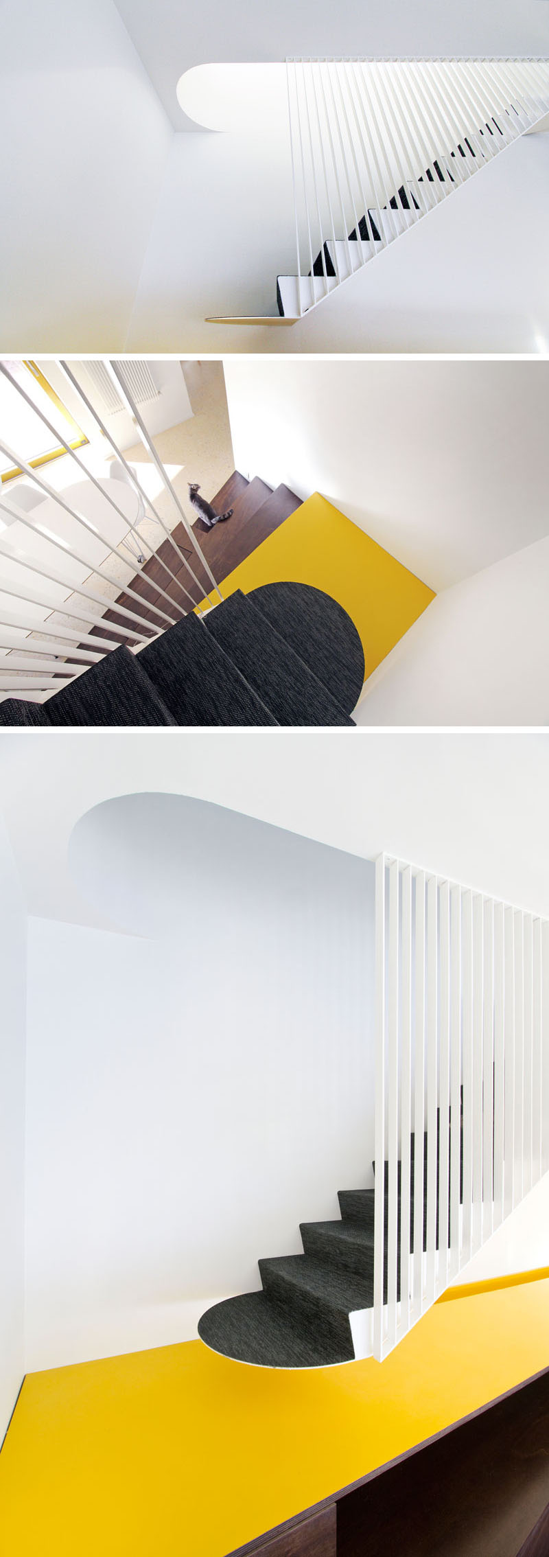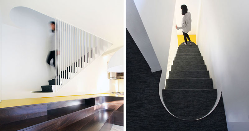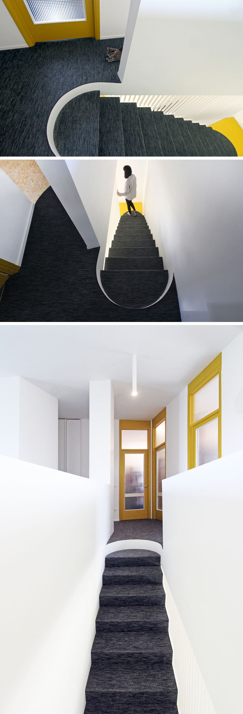 Bloomscape Mimarlık ile işbirliği yapan Perani,  evin yeniden tasarımının bir parçası olarak yaptığı merdivenin materyali metal. Mutfak ile aynı alanda bulunan beyaz boyalı metal asma merdivene, geniş mutfak tezgahı ve yemek odasında kullanılan gömme saklama tezgahından sonra ulaşılıyor. Merdivenin her iki ucunda da dairesel form bulunuyor  ve tamamen  gri halı kaplı. Bu halı merdivene hem yumuşak bir görünüm yaratmaya yardımcı olmuş  hem de merdivenin parlak beyaz duvarlara zıtlık oluşturmasını sağlamış.
