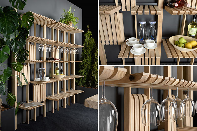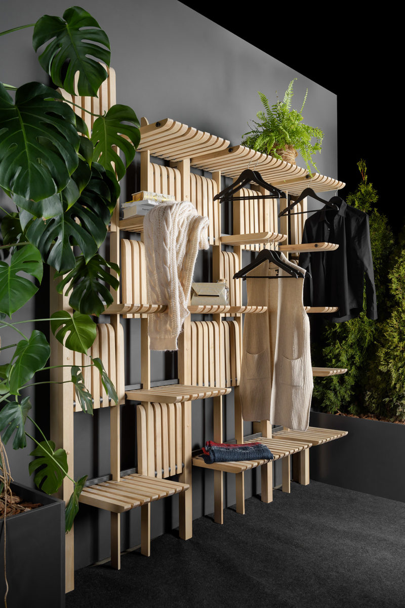 Raf ünitesi, bir metal çubuğun üzerine yerleştirilen, gerektiğinde ünitenin işlevinin değişmesini sağlayan hareketli ahşap çubuklara sahip. Parçalar, aşağı doğru katlandığında raflar gibi işleyebiliyor. Aynı zamanda çubuklar arasındaki boşluklar, çubukları bağlayan parçalara kıyafet asılmasına izin vererek açık bir gardırop olarak da kullanılabilmesini sağlıyor. Mutfak veya yemek alanında kullanıldığında, raflar tabakları, yemek kitaplarını ve bardakları saklamak için ayrı ayrı yerler yaratabiliyor.
