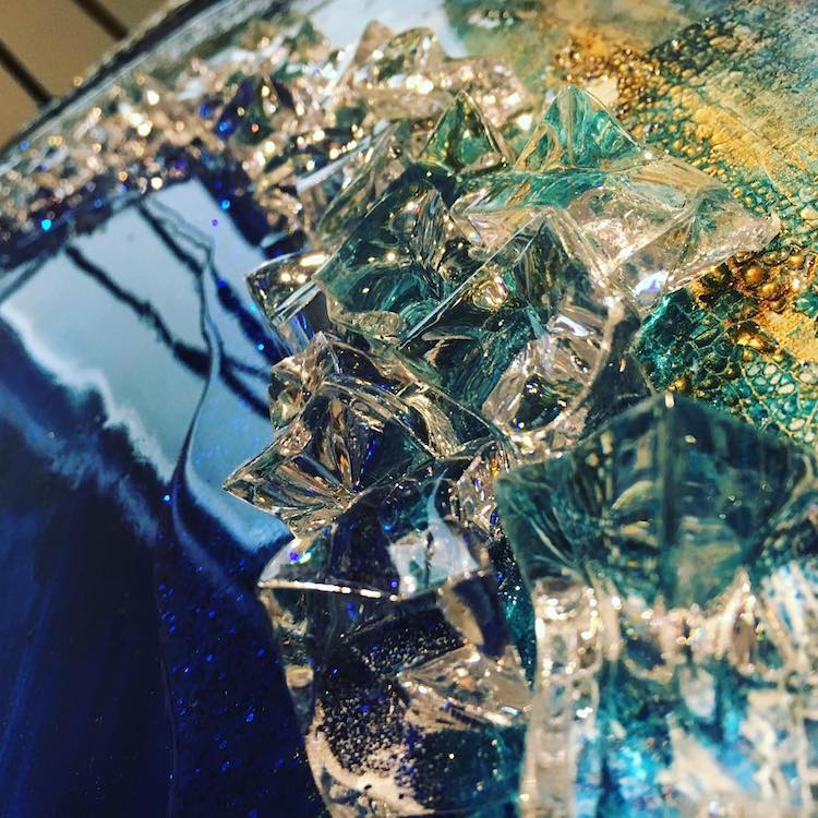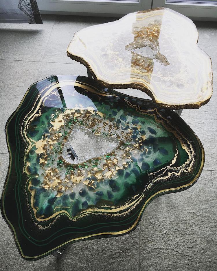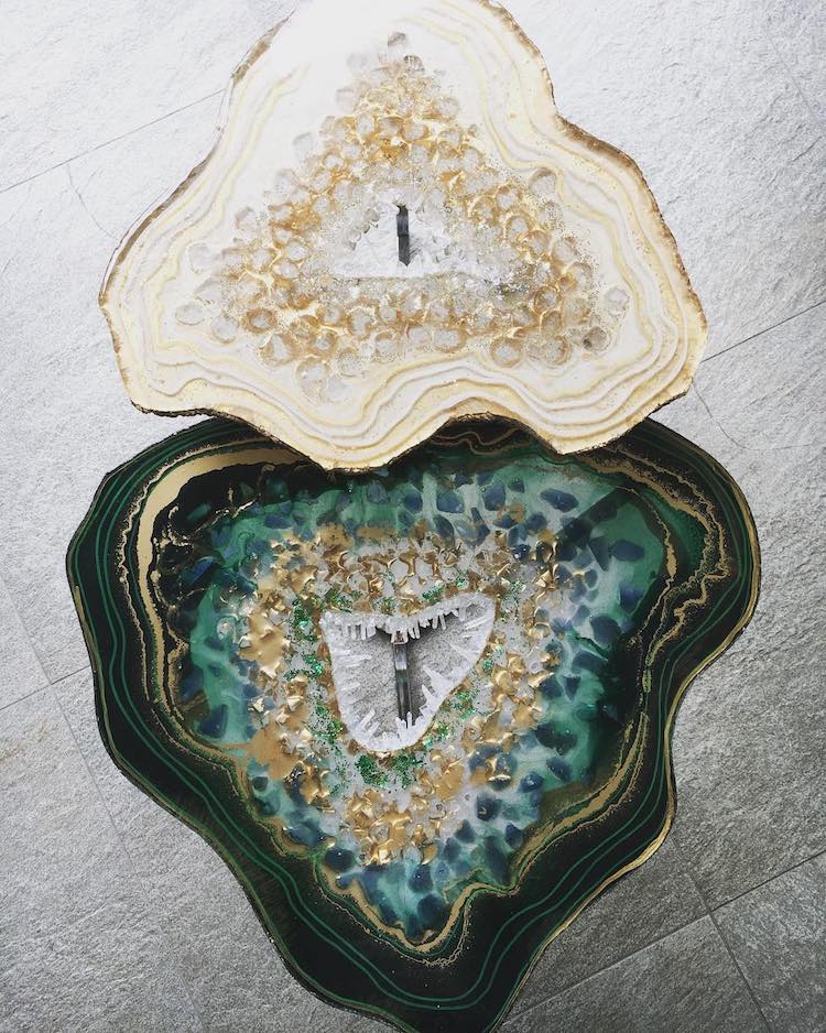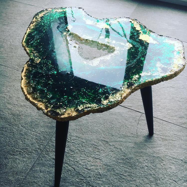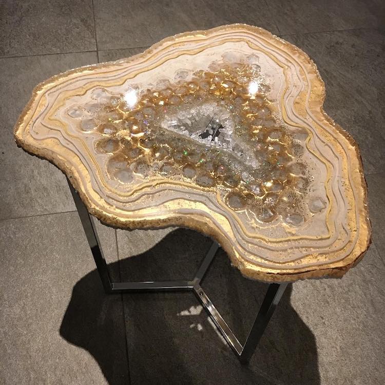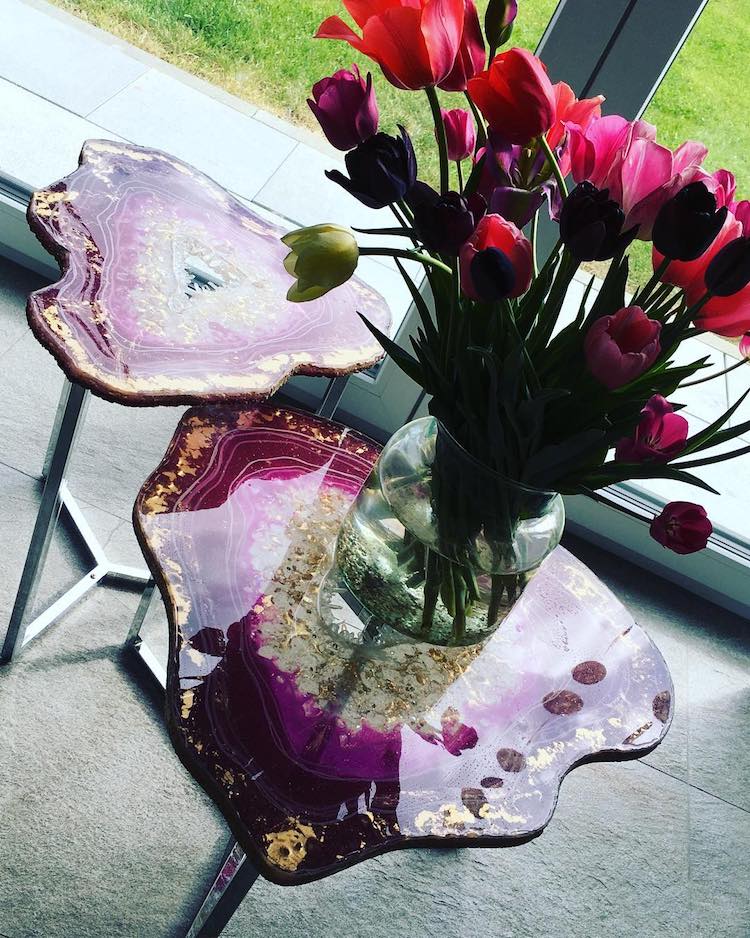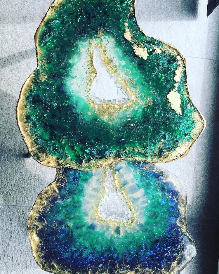 Bir sehpa serisi olan tasarım mobilyalar gerçek akik dilimleri gibi görünseler de,aslında dökülmüş reçineden yapılmış. Kristalleri, taşları, pigmentleri, parıltıları bir araya getiren Mrs Colorberry, kayaların içinde bulunan renkli, kristal yapıları çoğaltabiliyor. Detaylara ve malzemelerin yaratıcı kullanımına özeni, gerçek jeolojik yapıların hayranlık uyandırıcı estetiğini yakalayan göz alıcı masalara dönüşüyor. Aynı zamanda masa parçalarına ek olarak, Mrs Colorberry çarpıcı duvar süslemeleri ve birebir cheeseboards oluşturmak için de reçine kullanıyor. Ve bu çalışmalarını “Parçalarını dökmek çok sakinleştirici ve benim için meditasyon gibi,” diye açıklıyor. “Her gün yaratıcı olmaktan çok mutluyum, güzel taşların doğasından esinlenerek reçine ve akik / jeodes / şifa taşları ile uğraşmak…. Onlarla çalışmak ya da sadece benim reçinemi dökmek için onların aklımı meşgul etmesi beni mutlu ediyor. ”