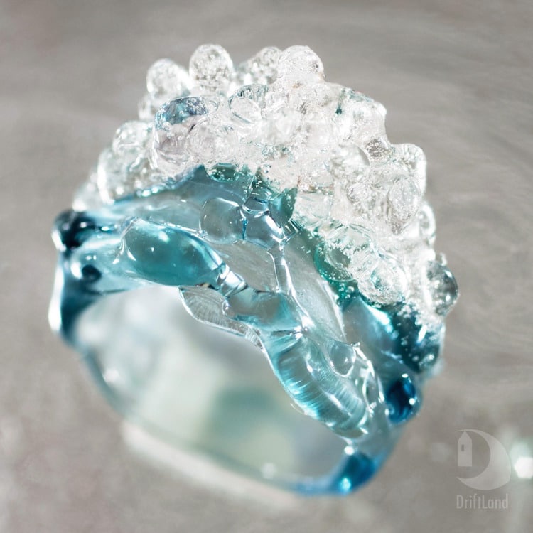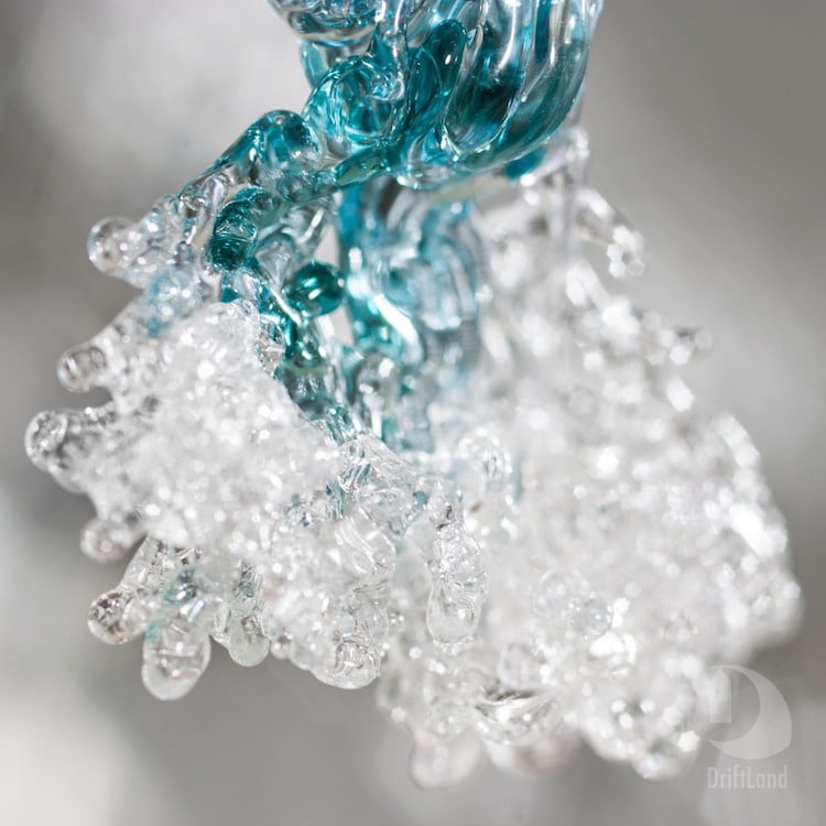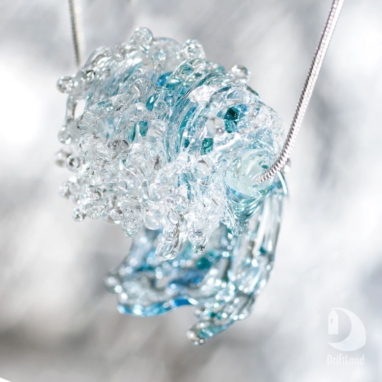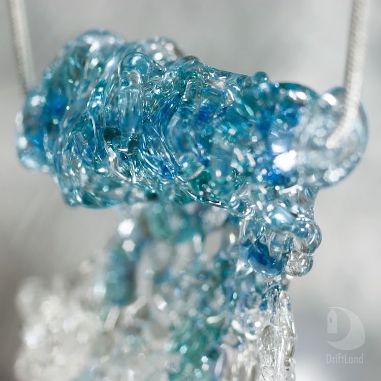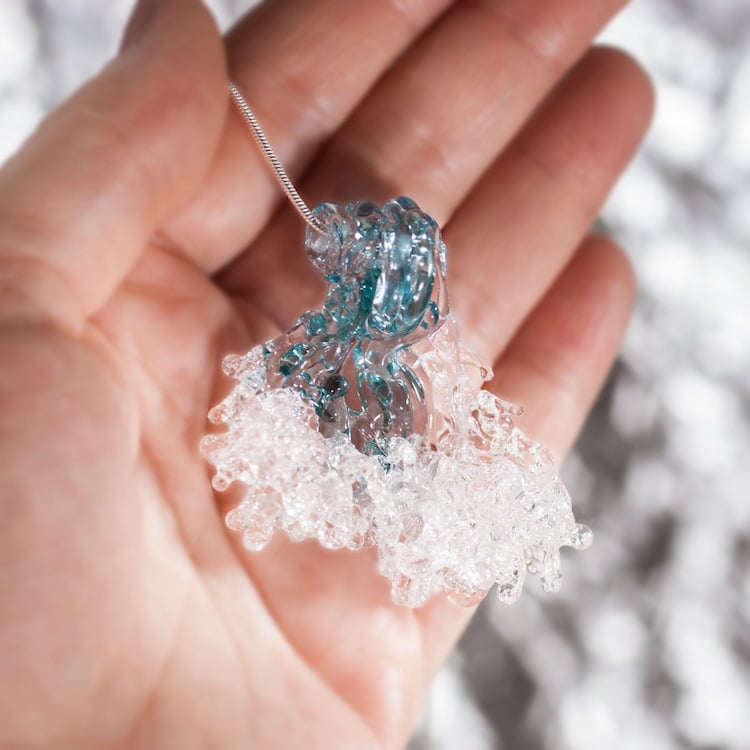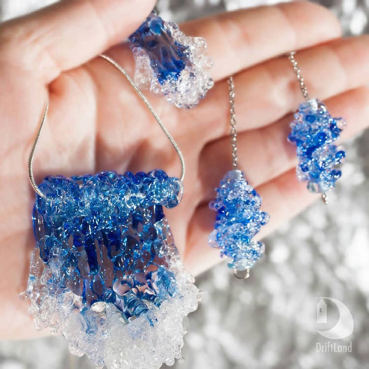Malzeme, sıcaklık kontrollü bir fırın kullanılarak eritildi, şekillendirildi ve soğutuldu. Ortaya çıkan cam takı parçaları, inanılmaz derecede dokusaldır ve dalgaların hareketini ölümsüzleştirmektedir.