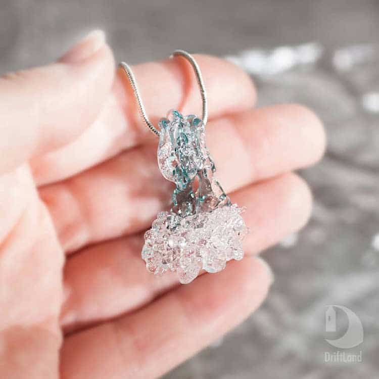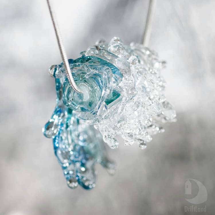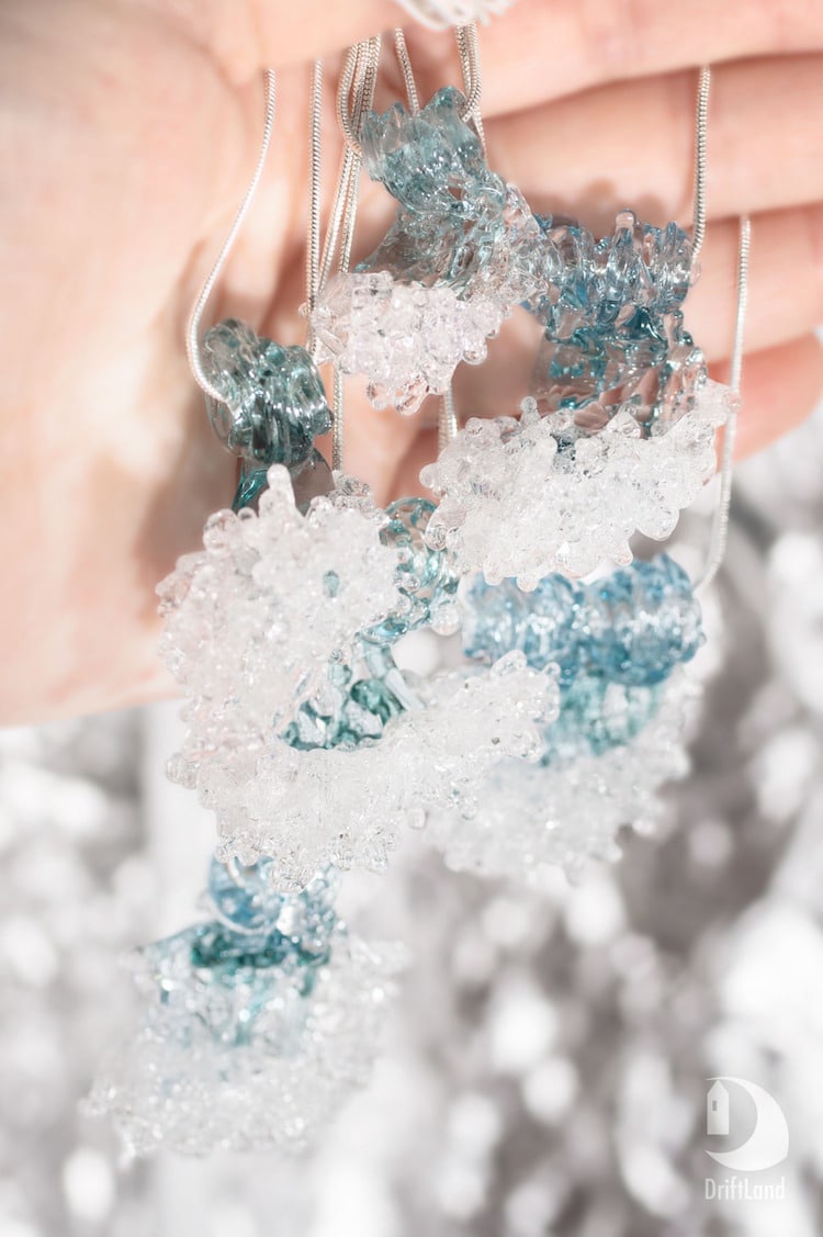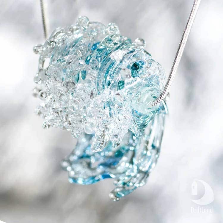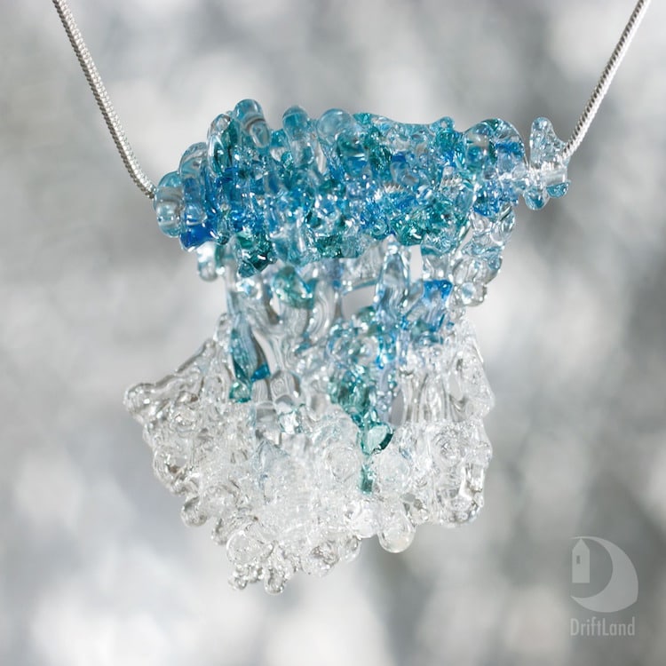 Malzeme, sıcaklık kontrollü bir fırın kullanılarak eritildi, şekillendirildi ve soğutuldu. Ortaya çıkan cam takı parçaları, inanılmaz derecede dokusaldır ve dalgaların hareketini ölümsüzleştirmektedir.