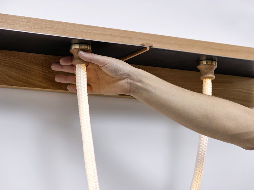 Studioknob’un yaratımının parçaları, düşük voltajlı elektriğin halattan geçmesine izin verir. Bu sayede, LED ışıklarla iç içe geçen halat metalleri, bir klik sesiyle metale bağlı olanları yakar.