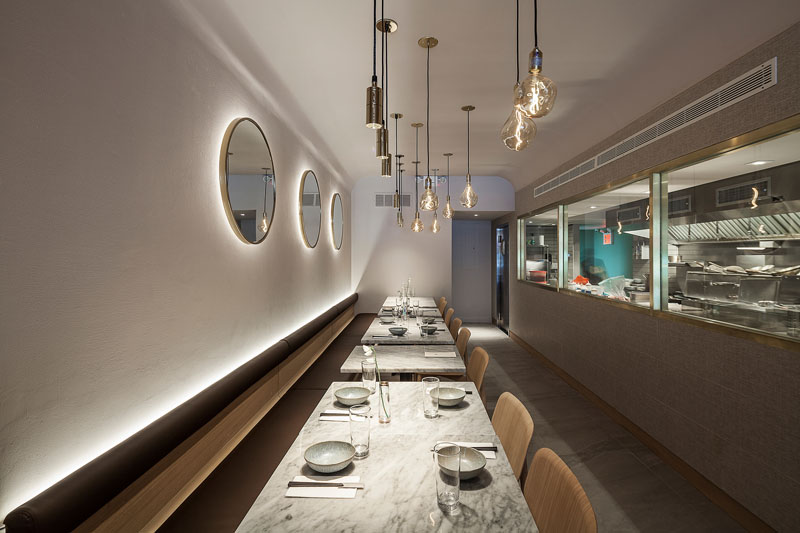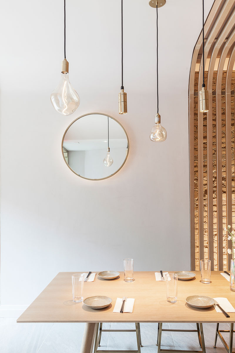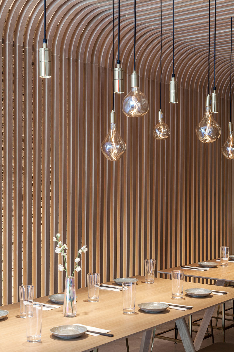 Restoran, sokak ile restoran arasında ilişki kuran büyük bir ön pencereye sahip. Ve bu pencere iç mekanı doğal ışıkla aydınlatıyor. Restoranda yer alan ahşap bir perde, duvar ve tavanı kaplıyor. Ahşap perde, arka kısmı ışıklandırılmış tuğla duvarların önünde bulunuyor.