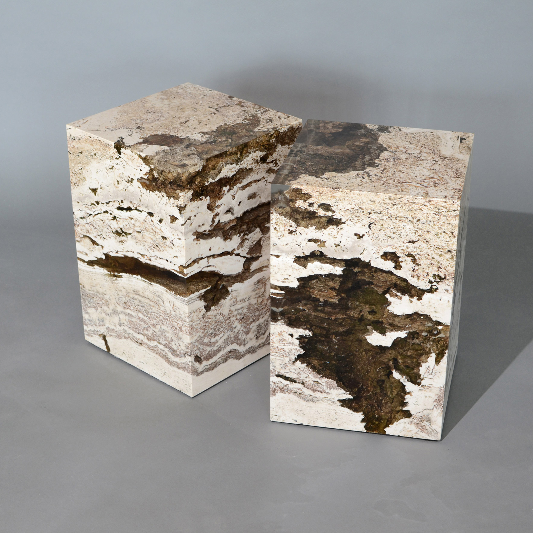 Beyaz, ten rengi, krem rengi ve hatta paslı olabilen traverten, kristal bir dokuya sahip karasal bir tortul kayadır. Sıcak mineral kaynakların biriktirdiği kireç taşı şeklindeki kalsitten oluşur. Yüzyıllar boyunca Romalıların termal banyolar için kullandıkları kaplıcalarıyla tanınan İtalyan şehri Rapolano’dan taşınır. Kayaç, genellikle bir kaplıca ağzında veya bir kireçtaşı mağarada karbonat minerallerinin çökmesiyle oluşur ve gözenekliliği makrofitler, biyofitler ve algler gibi organizmaların varlığına bağlıdır. MÖ 800’lü yıllarda Etrüsklerin zamanından beri bir yapı malzemesi olarak kullanılmıştır. Traverten parçaları İtalyan tasarım stüdyosu tarafından aynı konsepte dayanan uzun bir seri reçine mobilya serisinin en son parçalarıdır.