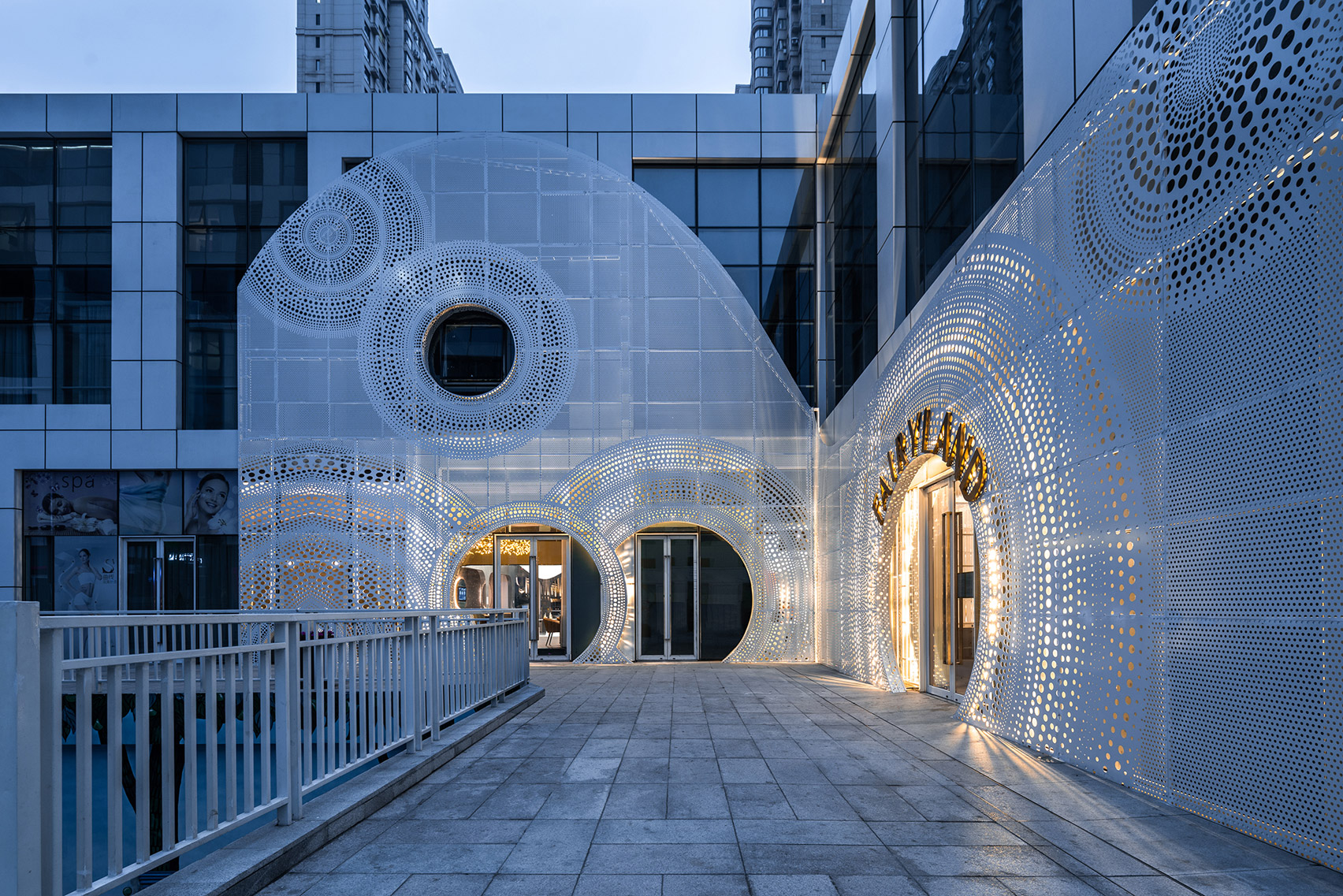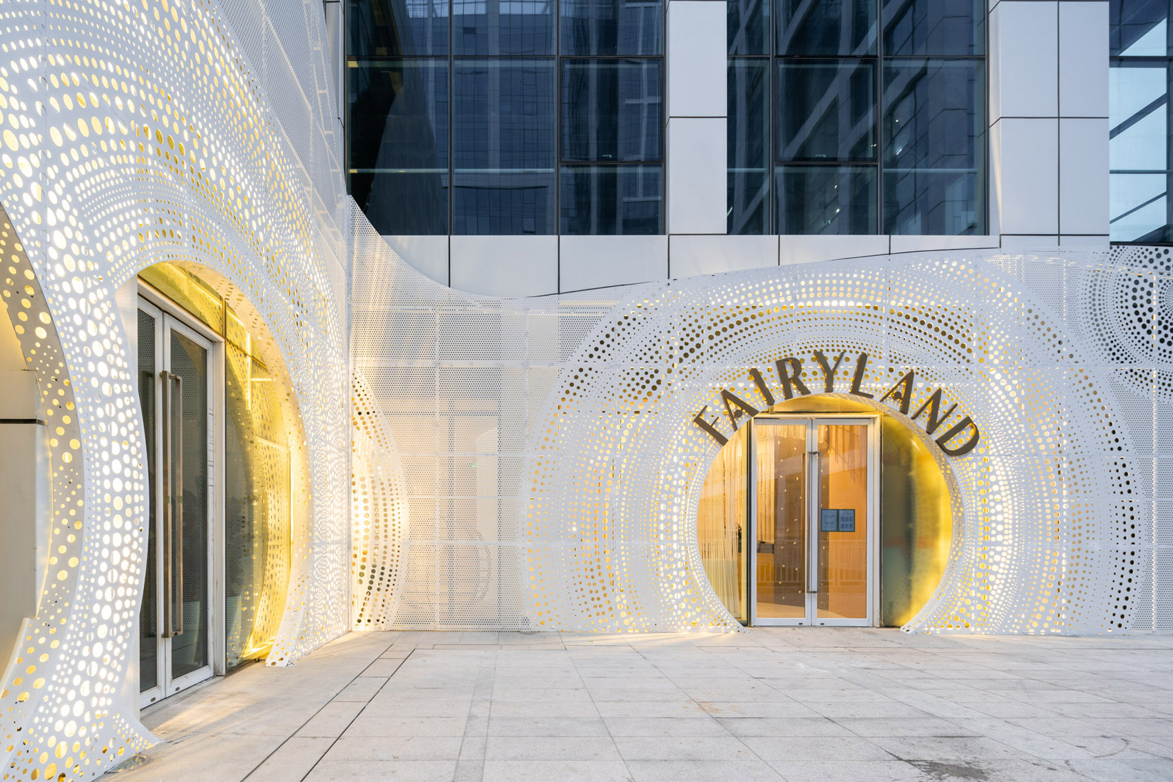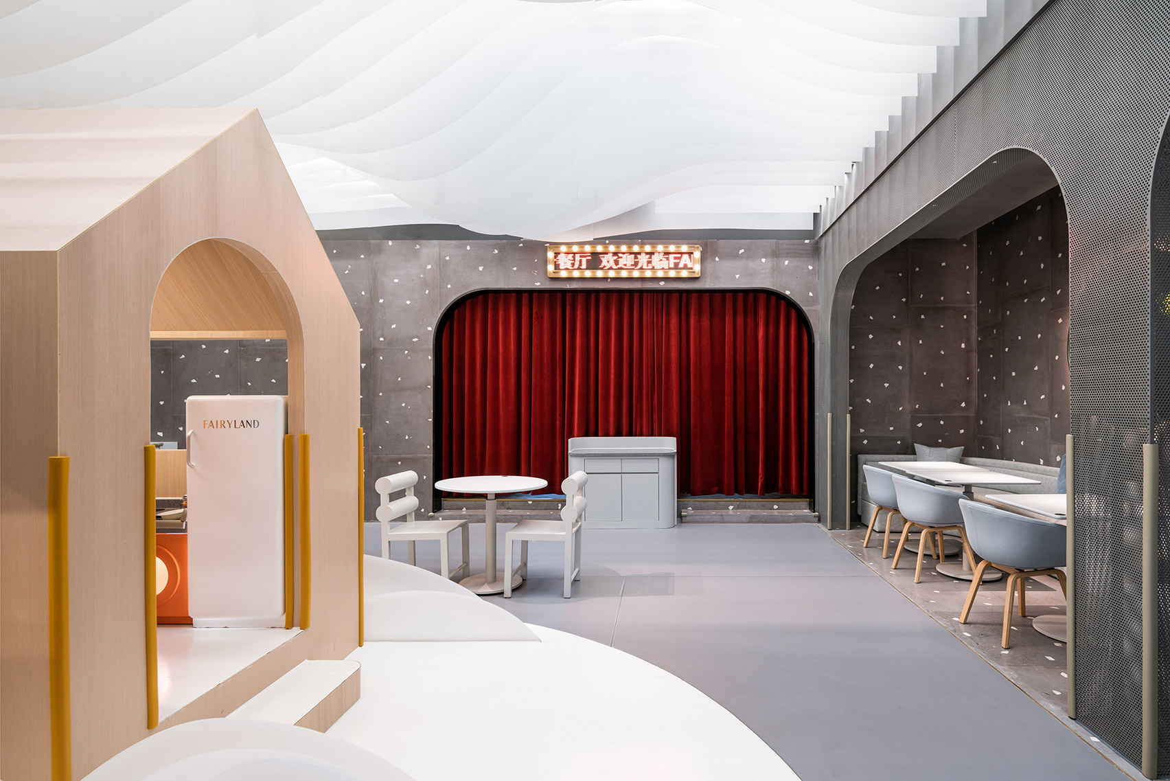 Hayali bir peri masalı fikri, Wutopia Lab’in kafenin tasarımındaki başlangıç ​​noktasıydı. Dışarıda, kafenin cephesi delikli yuvarlak, alüminyum panellerle kaplıdır. Bazıları dalgalanmalar oluşturmak veya binanın çeşitli giriş noktalarını çerçevelemek için tasarlanmıştır.