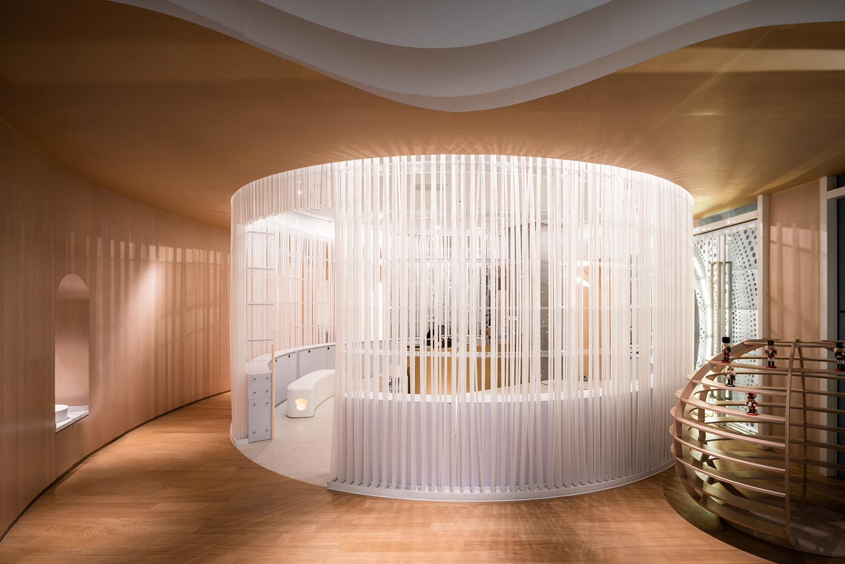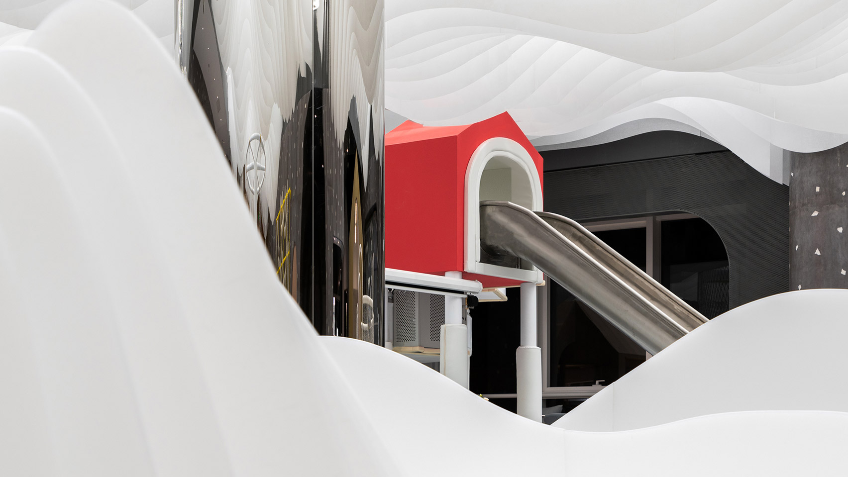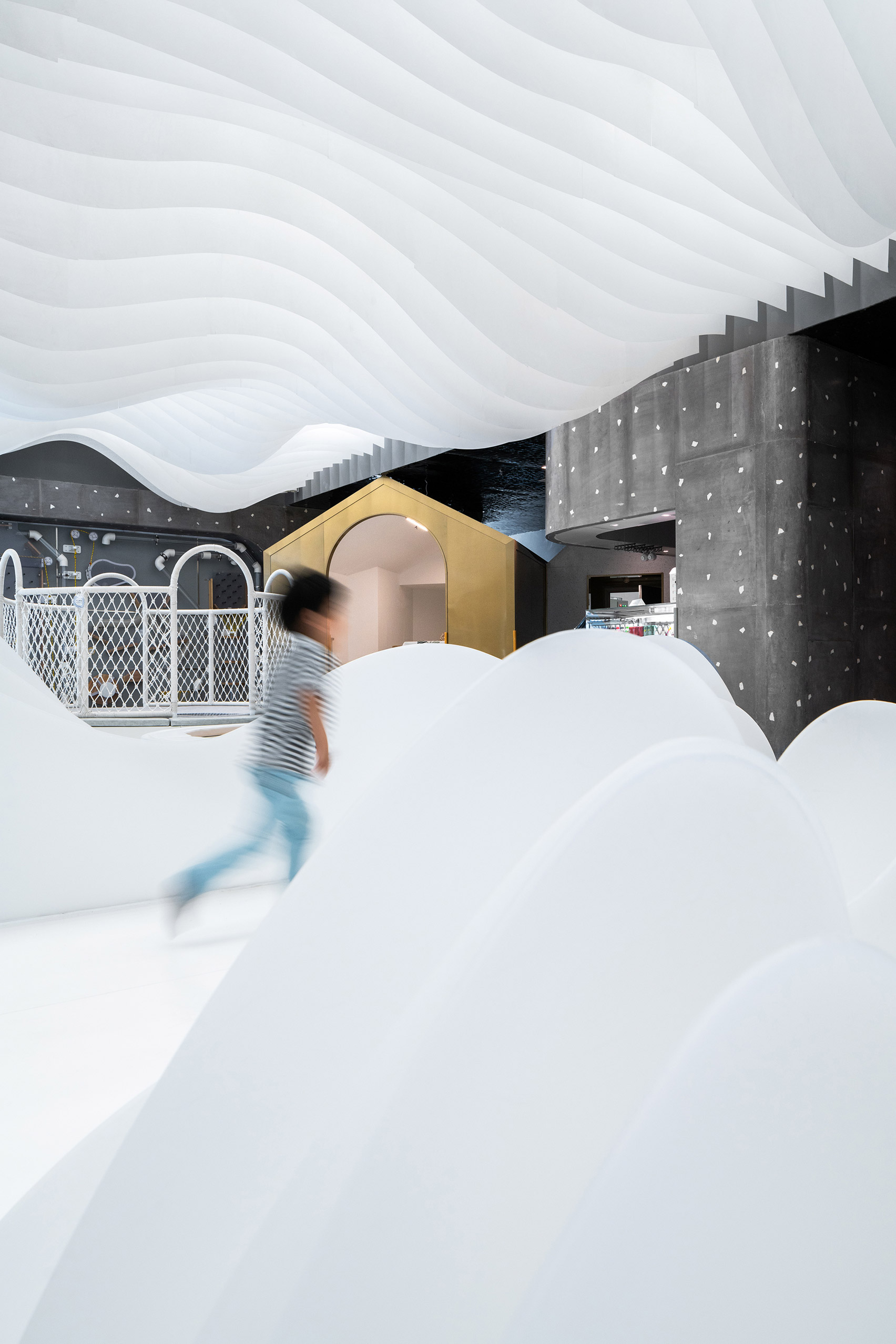 Bir dizi öğrenme-oyun alanı ve kavisli dekor detaylarına sahip 580 metrekarelik Lolly-Laputan, Wutopia Lab tarafından Çin'deki ilk eğitim aile kafesi olarak tasarlandı.