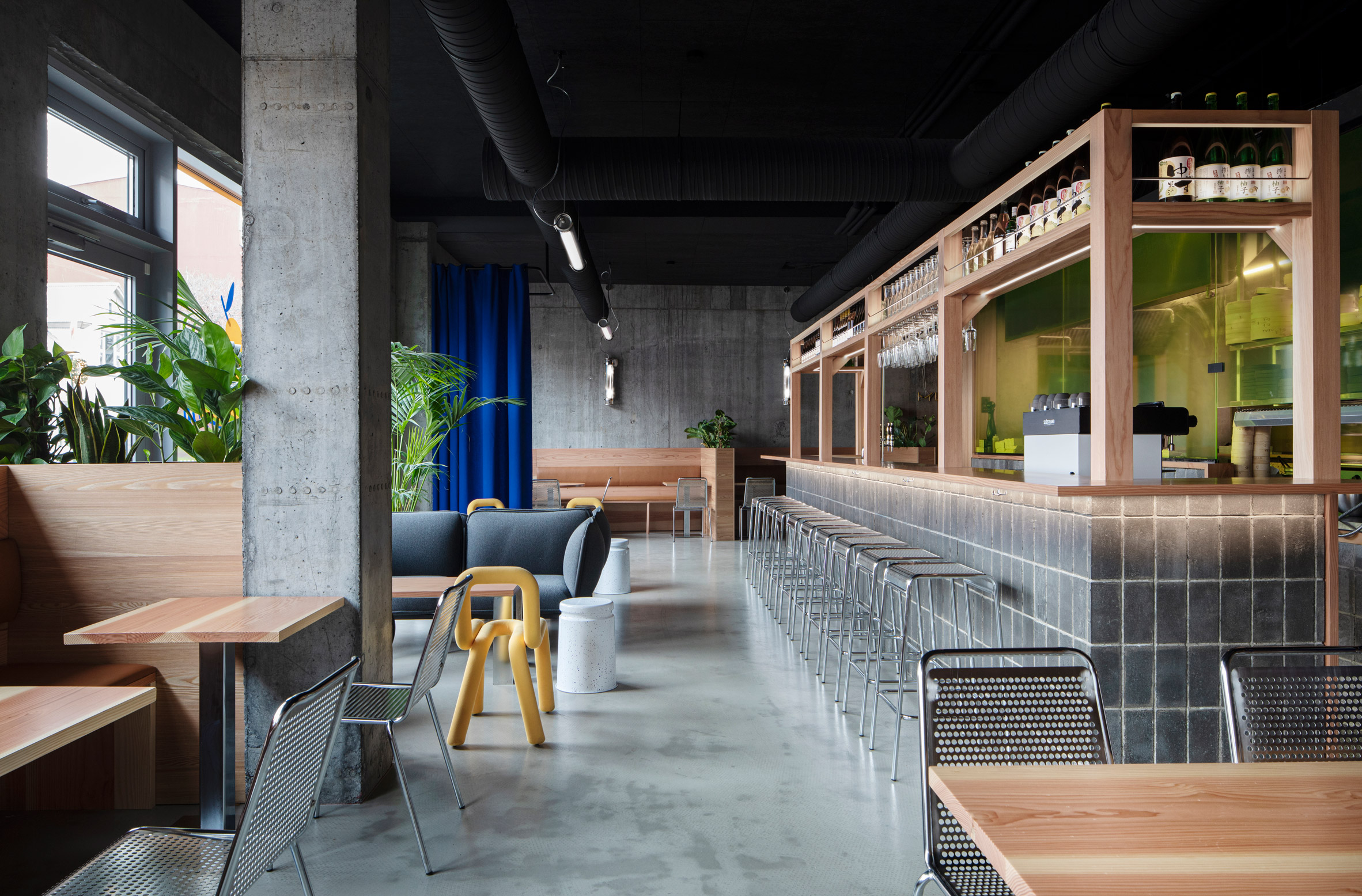 80 kişilik restoran, yuzu meyvesinin rengini referans alan sarı camla sarılmış merkezi bir açık mutfağın etrafında bulunmaktadır. Restoranın oturma alanı, oturma sıraları, ayrı masa ve sandalyeler, bar tabureleri ve daha samimi kabin alanları ile çeşitlendirilmiştir.